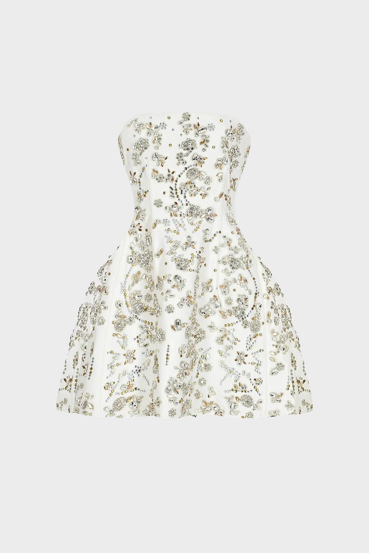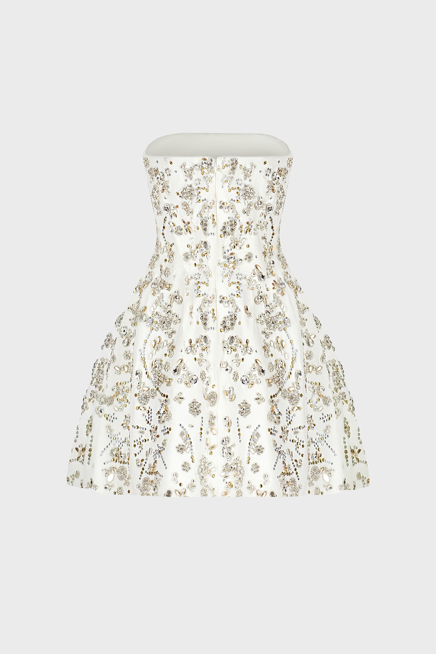 Krep kumaştan yapılmış, arkadan fermuarlı, kristal taşlarla süslenmiş, straplez, mini elbise.