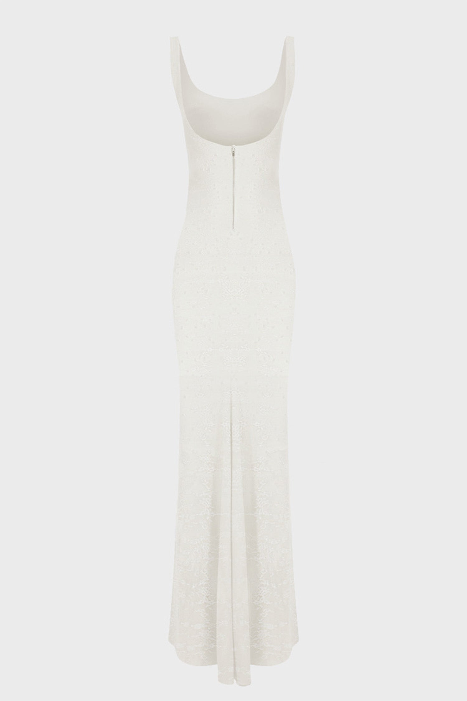 Krep ve dantel kumaştan yapılmış, kalın askılı, U yaka, sırtı açık, kuyruklu maksi elbise.