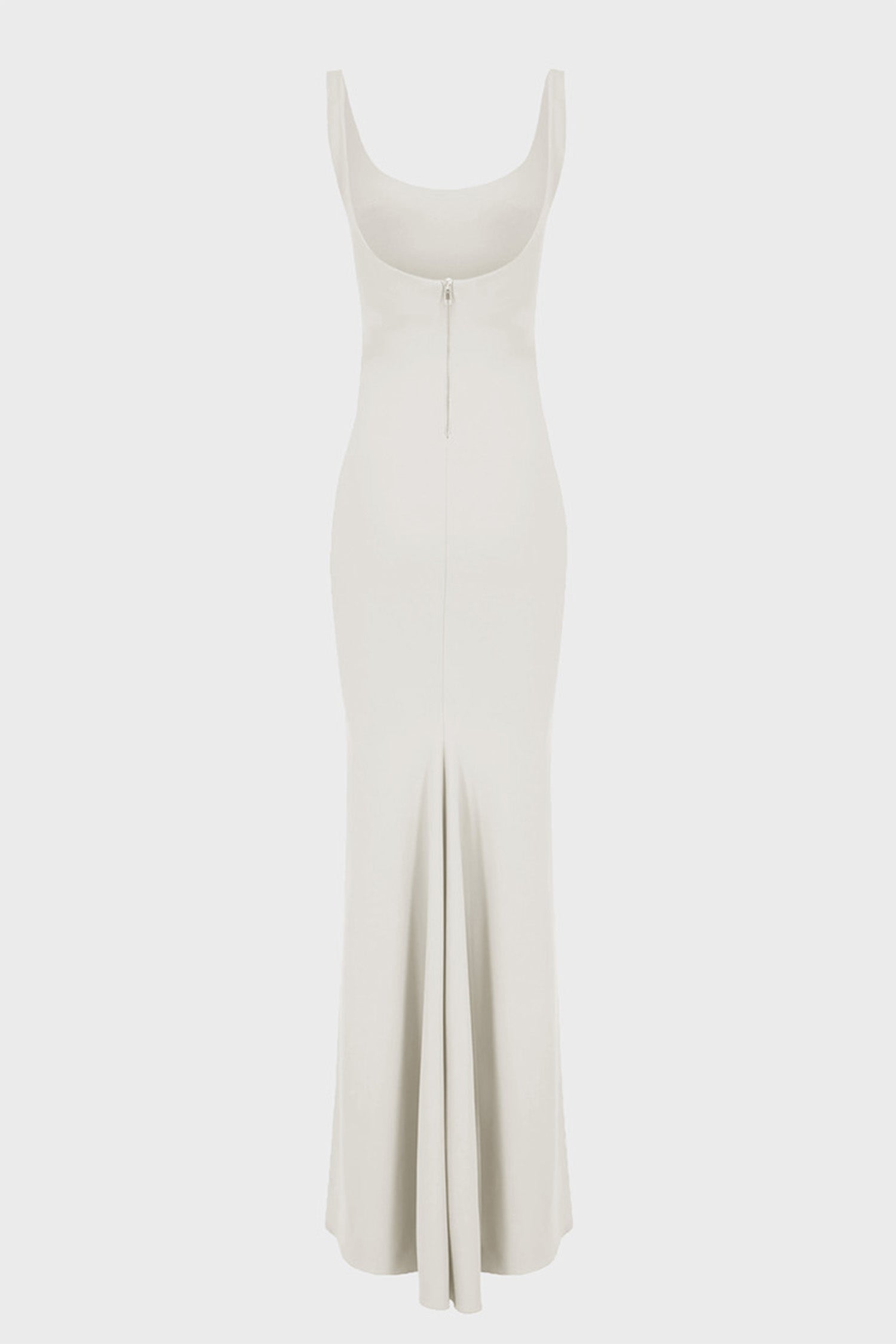 Krep jarse kumaştan yapılmış, kalın askılı, U yaka, sırtı açık, kuyruklu maksi elbise.